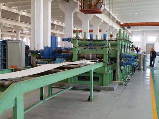纵剪机又叫纵剪机组,纵剪线,将金属卷料裁剪成所需各种宽度的条料,再将条料收成小卷供下道工序使用,是变压器、电机行业及其它金属带材精密剪切的必需设备。它用于主要分条剪切的材料有马口铁、镀锌铁、硅钢片、冷轧带钢、不锈钢带、铝带、钢带等卷料。 纵剪线种类很多按可纵剪板厚分为薄板纵剪线、厚板纵剪线;按纵剪金属材质可分为不锈钢纵剪线、铜带纵剪线、冷板纵剪线、硅钢纵剪线等。 按自动化程度,可分为全自动纵剪线,半自动纵剪线。 在制管机客户就需要使用纵剪线分条得到自己所需要的尺寸,在通过制管成型机生产自己所需要的尺寸管材。 纵剪线的主要流程就是:板卷存放→上卷→开卷→引头→夹送粗矫→切头→废料收集→活套→对中→纵剪→废边卷取→活套→分离涨紧→分切→分离收卷→卸料